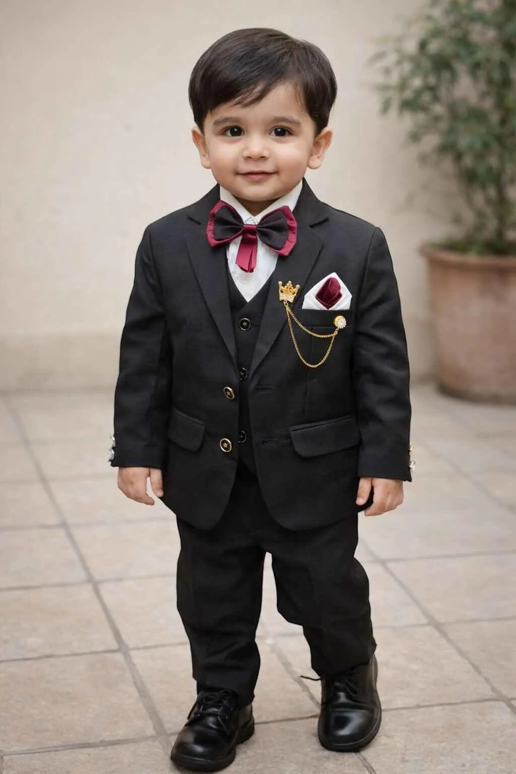 This luxury black 5 piece boys tuxedo suit features a tailored blazer, matching pants, and an elegant waistcoatβperfect for weddings, birthdays, parties, and special occasions. Premium fabric, modern fit, unforgettable style.