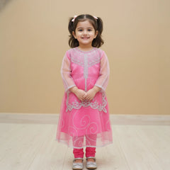 Girls pink embroidered fancy frock set is designed with delicate threadwork, sheer organza sleeves, and a stylish layered hem. The bright pink color and intricate detailing make it perfect for Eid, weddings, birthdays, and party occasions. Soft fabric ensures all day comfort while giving a premium festive look.